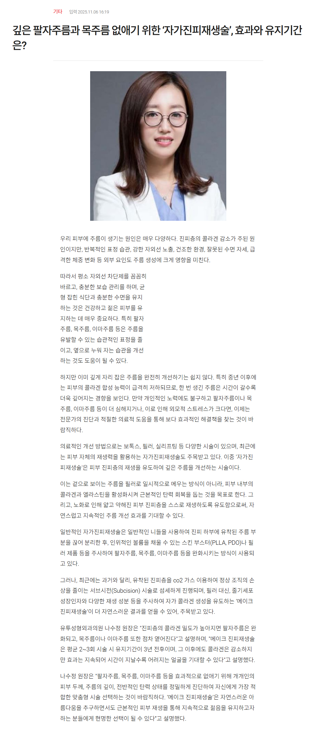 목 · 팔자주름 등 깊은 주름 개선을 위한 ‘자가진피재생술’ 효과 · 유지기간은?