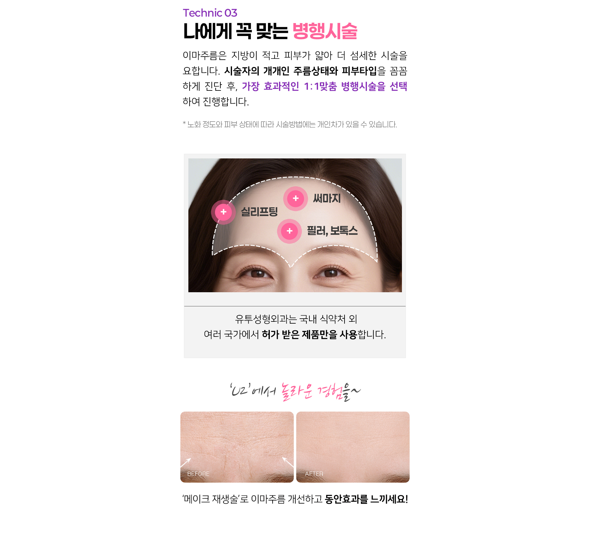 피부 타입은 의료진의 정확한 소견이 필요합니다. 얇거나 두꺼워도 어떤 시술을 병행하느냐에 따라 효과를 극대화 시킬 수 있습니다. 유투성형외과에서 효과와 방안에 대해 객관적이고 정확하게 상담을 받아보세요.