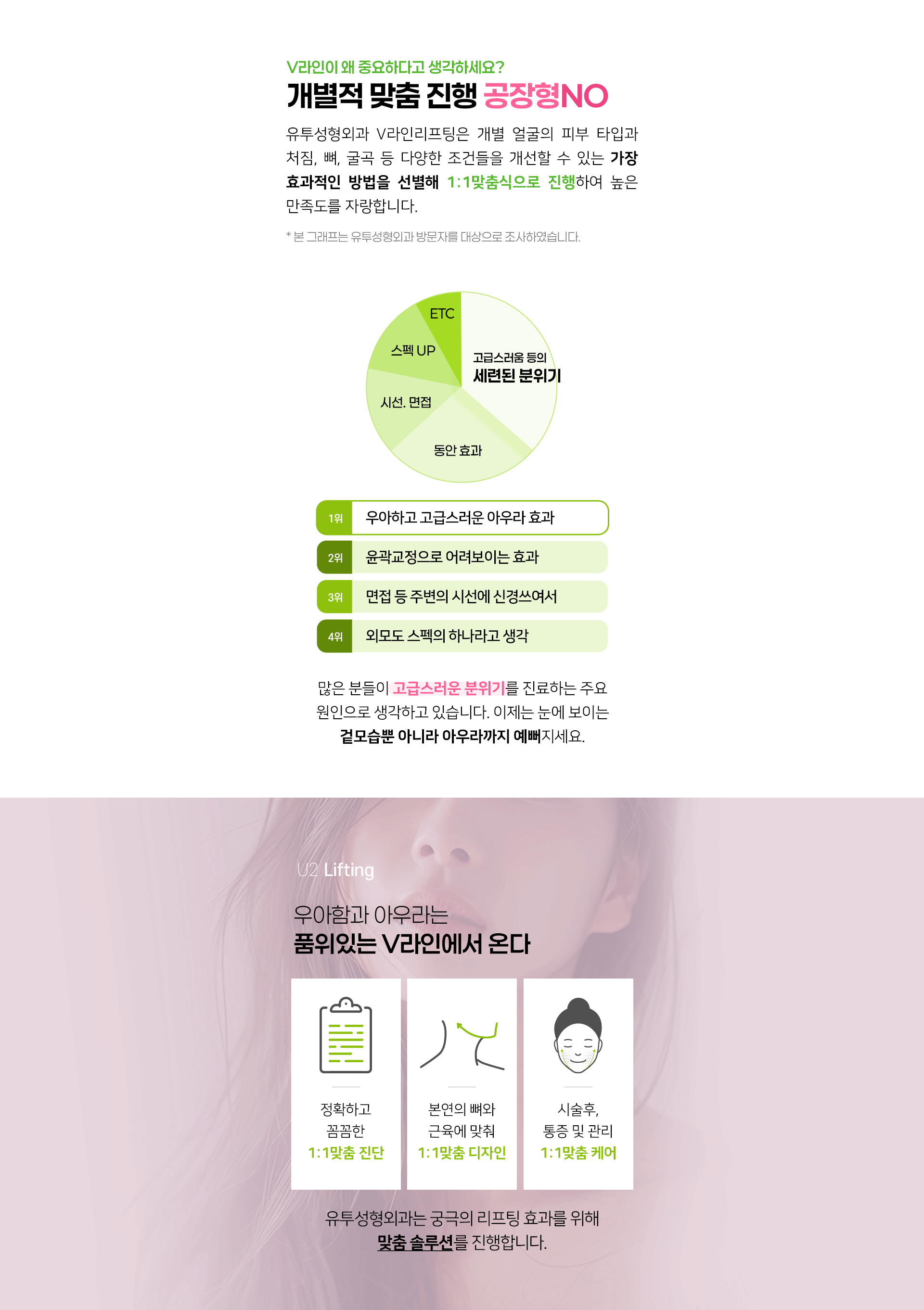 유투성형외과에서는 1:1 맞춤시술을 지향합니다. 극대화 시킬 수 있는 최상의 방법과 부담되시면 최소한의 방법 등 진료자가 선택할 수 있는 최선의 방법을 제안해드리며, 충분한 고민을 하실 수 있도록 도와드리고 있습니다. 지금 내원하셔서 1:1 상담을 한 번 받아 보시기 바랍니다.