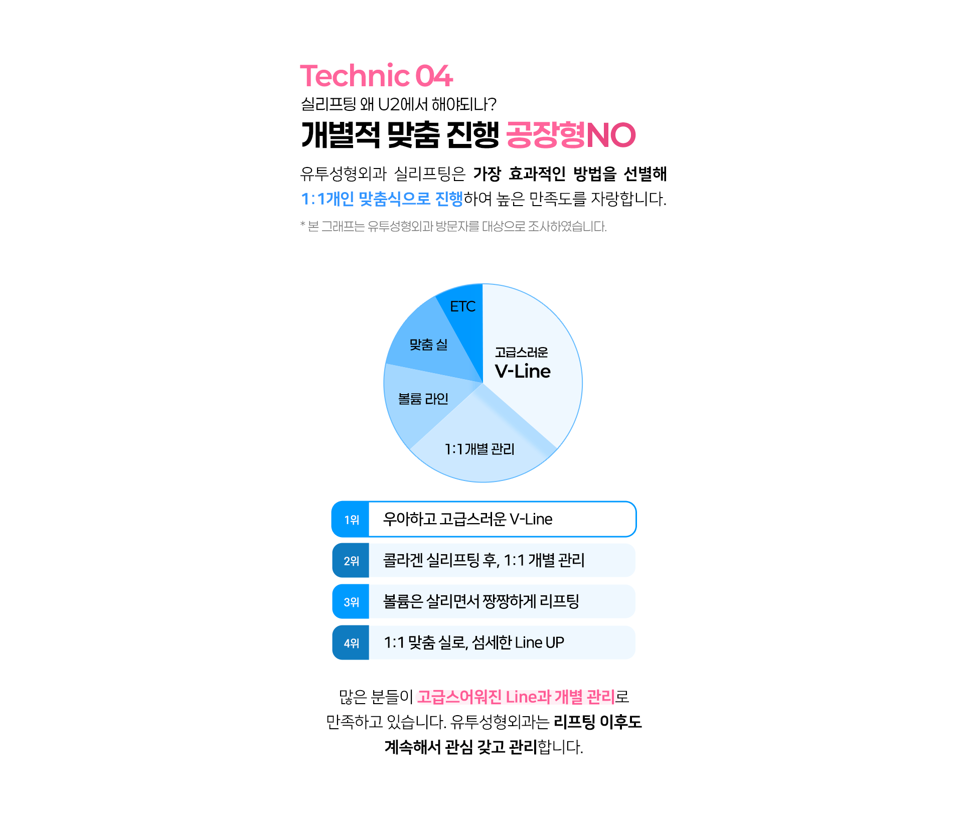 유투성형외과에서는 1:1 맞춤시술을 지향합니다. 극대화 시킬 수 있는 최상의 방법과 부담되시면 최소한의 방법 등 진료자가 선택할 수 있는 최선의 방법을 제안해드리며, 충분한 고민을 하실 수 있도록 도와드리고 있습니다. 지금 내원하셔서 1:1 상담을 한 번 받아 보시기 바랍니다.