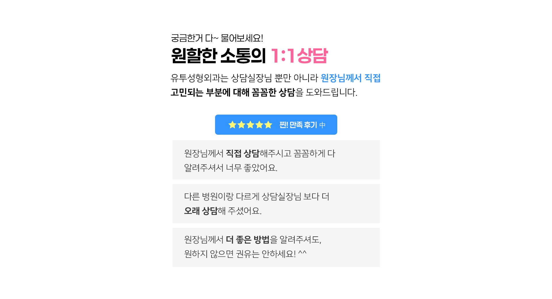 유투성형외과에서는 원하시는 효과를 극대화 시킬 수 있는 최적의 방법을 찾아드리며, 특히 1:1맞춤 병행시술은 많은 분들이 높은 만족도를 평가하십니다. 충분한 고민을 하실 수 있도록 도와드리므로 지금 내원하셔서 상담을 받아 보시기 바랍니다.